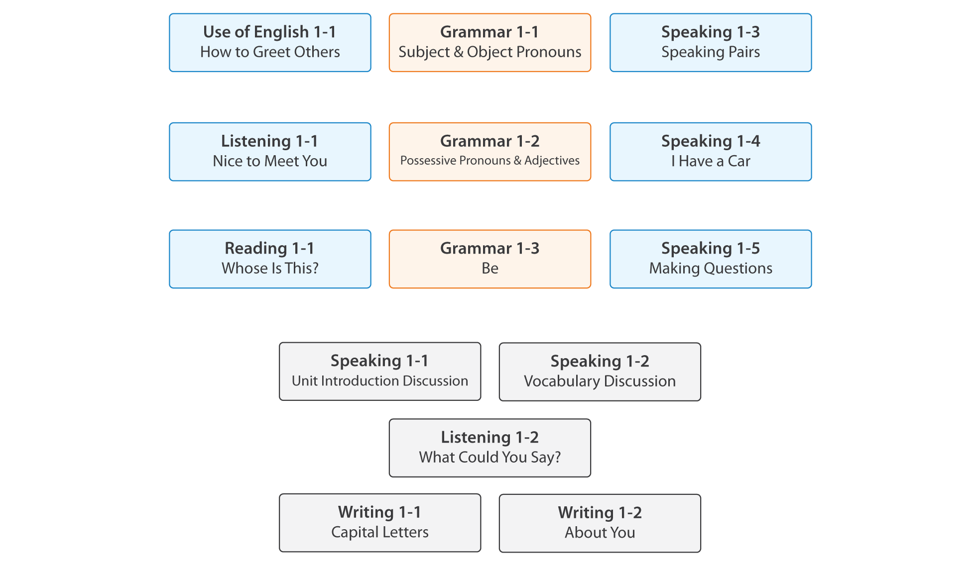 1-1 Unit Introduction DiscussionIntroductory speaking practice about topics in the unit. 1-2 Vocabulary DiscussionPracticing the use of new vocabulary in conversation. 1-3 Making QuestionsPracticing the use of subject and object pronouns in speaking. 1-4 I Have a CarPracticing the use of possessive pronouns and adjectives in speaking. 1-5 Making QuestionsPracticing the use of “be” for asking questions. |