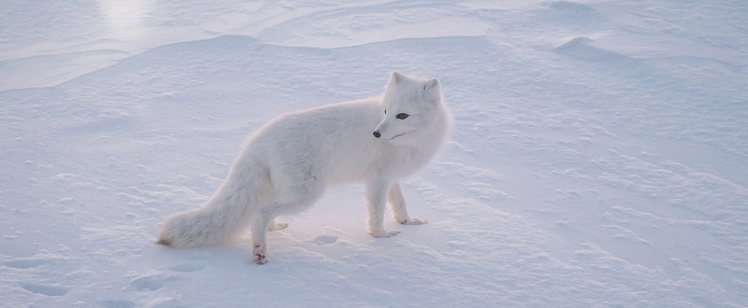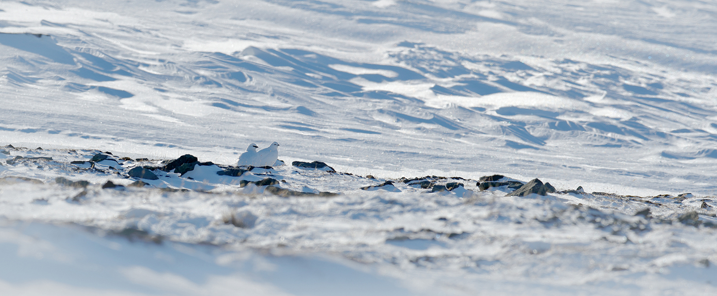 Look at this snowbank. Can you see any animals hiding here? Some animals hide in the snow. They are the same colour as the snow. Look one more time. Can you see them?