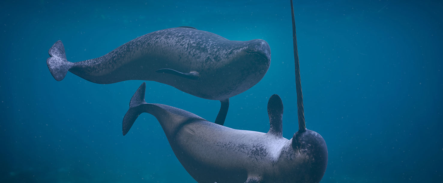 Narwhals live in the Arctic. They are a type of whale with a long tusk. They use their tusks to break ice, and fight. We call narwhals sea unicorns. Do you think narwhals look like unicorns?